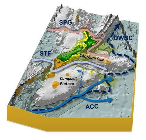 Southern Zealandia intercepts the Antarctic Circumpolar Current that brings cold, polar waters to Aotearoa-NZ. Driven by powerful westerly winds, the ACC flows 24,000 km clockwise around Antarctica. It is Earth’s longest and largest ocean current, and the only one to inter-connect the major oceans. Locally, off Campbell Plateau, the ACC overrides one of the largest deep western boundary currents (DWBCs) that travel north from Antarctica. Together, the ACC and DWBCs dominate the Southern Ocean and are major influences on the global distribution of heat, salt, gases and nutrients.