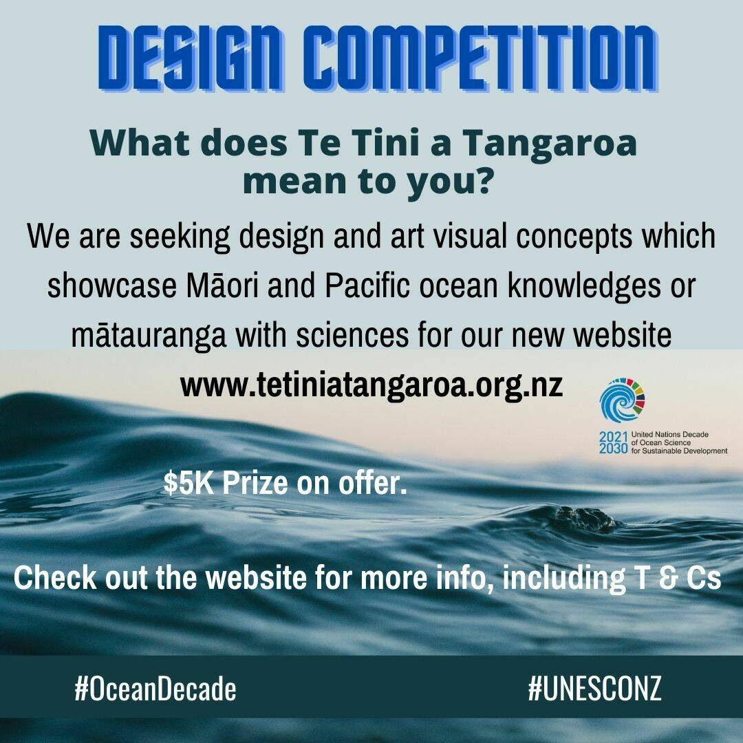 We would like to use a logo/ visual reference on our website https://tetiniatangaroa.org.nz/ from burgeoning designers or artists to reflect these knowledges. The winning designer or artist will work with our team to incorporate their design on our website, win $5,000 in cash and will feature in the Aotearoa New Zealand communications during the Decade. New Zealand’s focus for the UN Decade of Ocean Science for Sustainable Development https://www.oceandecade.org is to develop transformative multidisciplinary science grounded in Māori and Pacific Ocean knowledges to better address the decline in ocean health.